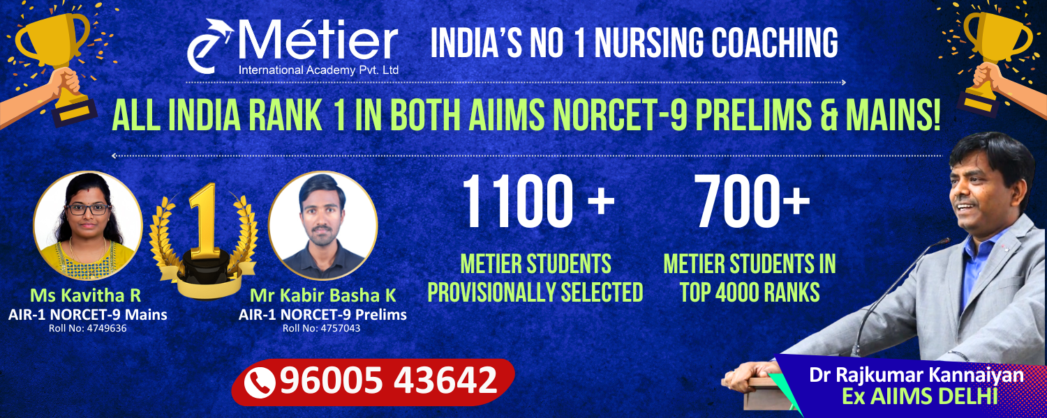 We are thrilled to announce that Métier students have secured All India Rank 1 in both AIIMS NORCET-9 Prelims and Mains — a true testament to the excellence of our students and the guidance of our mentor, Dr. Rajkumar Kannaiyan (Ex-AIIMS Delhi).